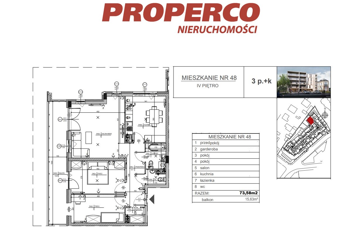 3-room apartment with an area of 73.58 sqm, located on the 4th floor of an apartment building on Niska Street in the center of Kielce. The apartment consists of a living room, kitchen , 2 bedrooms, wardrobe, bathroom , separate toilet, and entrance hall. The living room and bedrooms have access to a balcony with an area of 15.63 sqm. The heating and hot water are supplied from the municipal network - there are no gas heaters. A parking space in the underground garage is available for an additional price of 55,000 PLN net, and a storage room is available for 6,000 PLN/sqm.