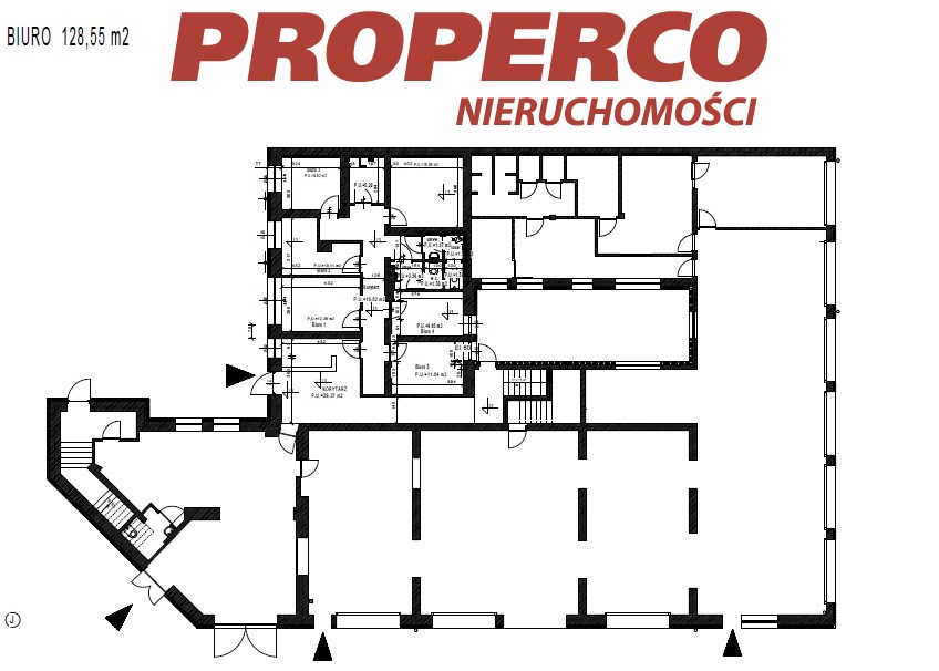 Parter (128,55 m2): 6 pomieszczeń biurowych, kuchnia, 2x WC, recepcja.