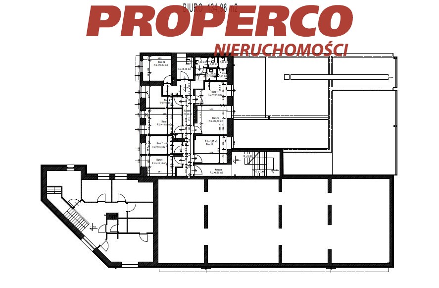 Piętro 1 (134,96 m2): 8 pomieszczeń biurowych biurowych, kuchnia, 2x WC.