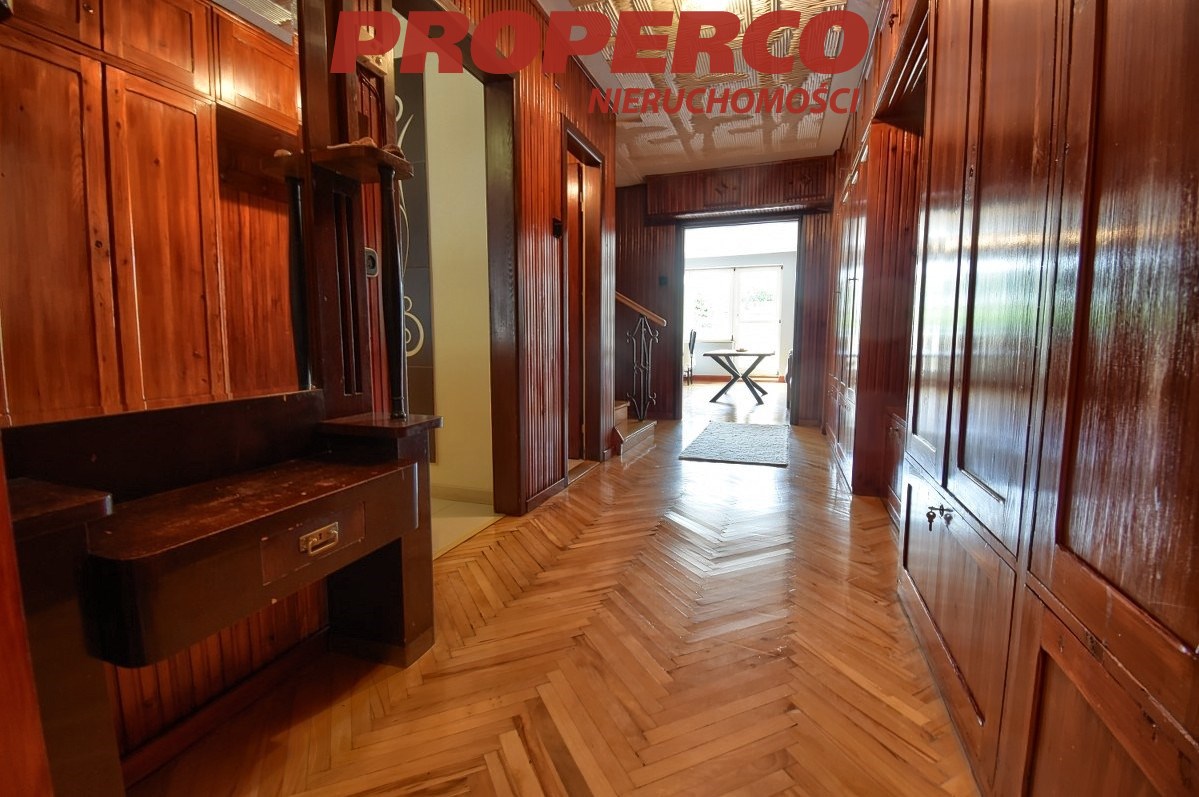 Na podłogach w pokojach i korytarzach - parkiet, w łazienkach, kuchni i piwnicy - gresy. Stolarka drewniana, w dobrym stanie. Zamontowano rolety antywłamaniowe.