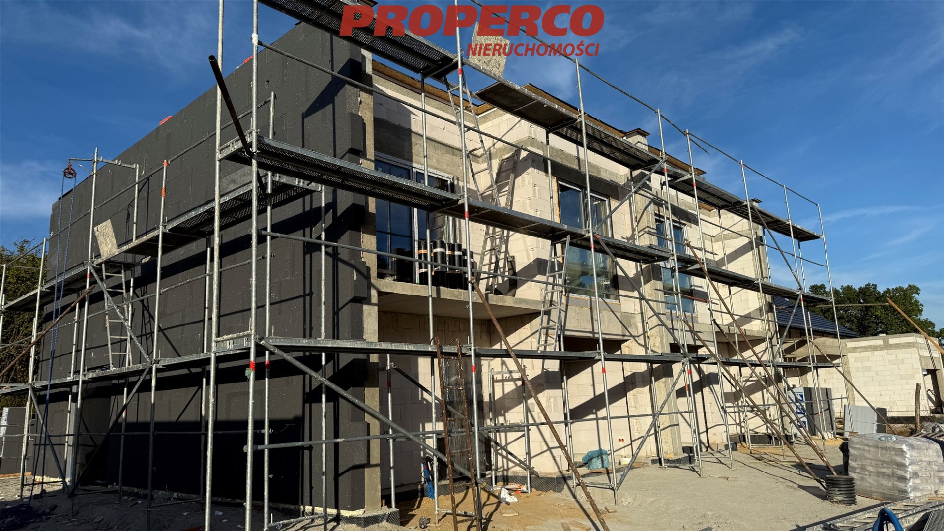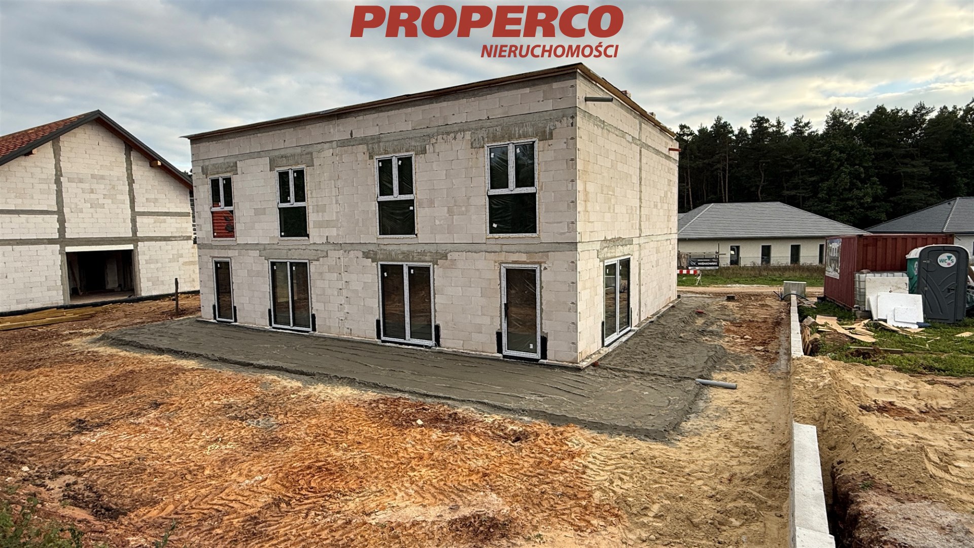 Dom stanie deweloperskim, teren przy budynku zostanie zagospodarowany. Budynek zostanie wybudowany z bloczka wapienno-piaskowego, ocieplony styropianem o grubości 20cm, planowane ogrzewanie pompą ciepła. Dach płaski z pełną izolacją termiczną.