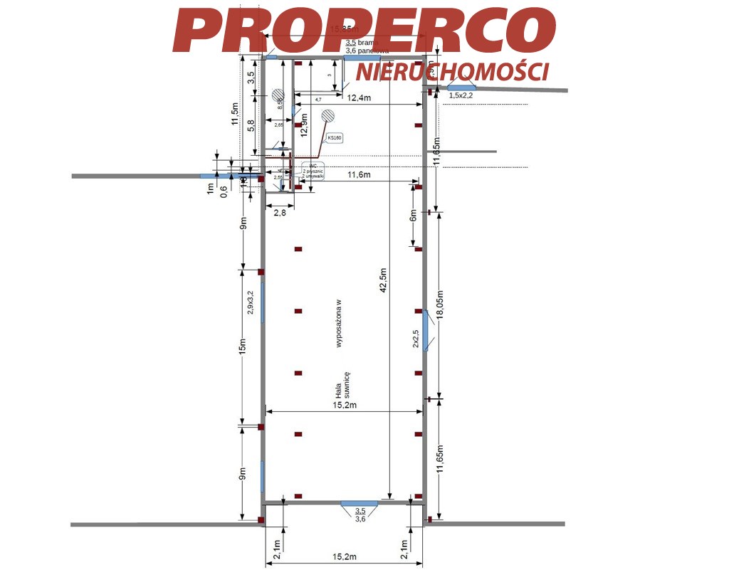 For rent: hall with an area of 650 m², located in the southern part of the city, with dimensions approx. 42,5 m x 15,3 m.
