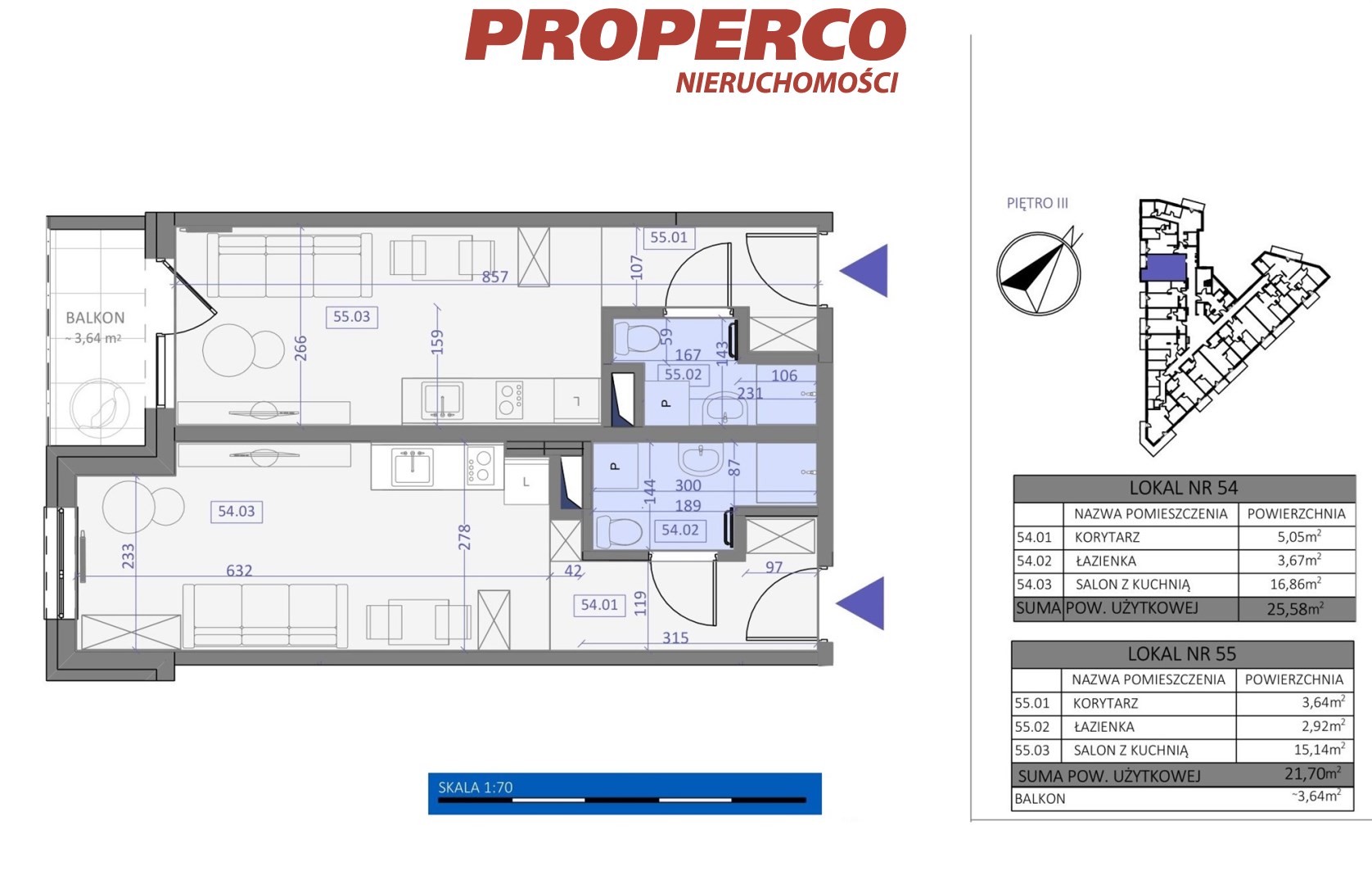 Mieszkanie podzielone na 2 mniejsze o pow. 21,7 m2 i 25,58 m2. Na powierzchnię składają się: 2 x salon z aneksem kuchennym, 2 x łazienka, 2x korytarz oraz do jednego lokalu: balkon (3,64 m2).