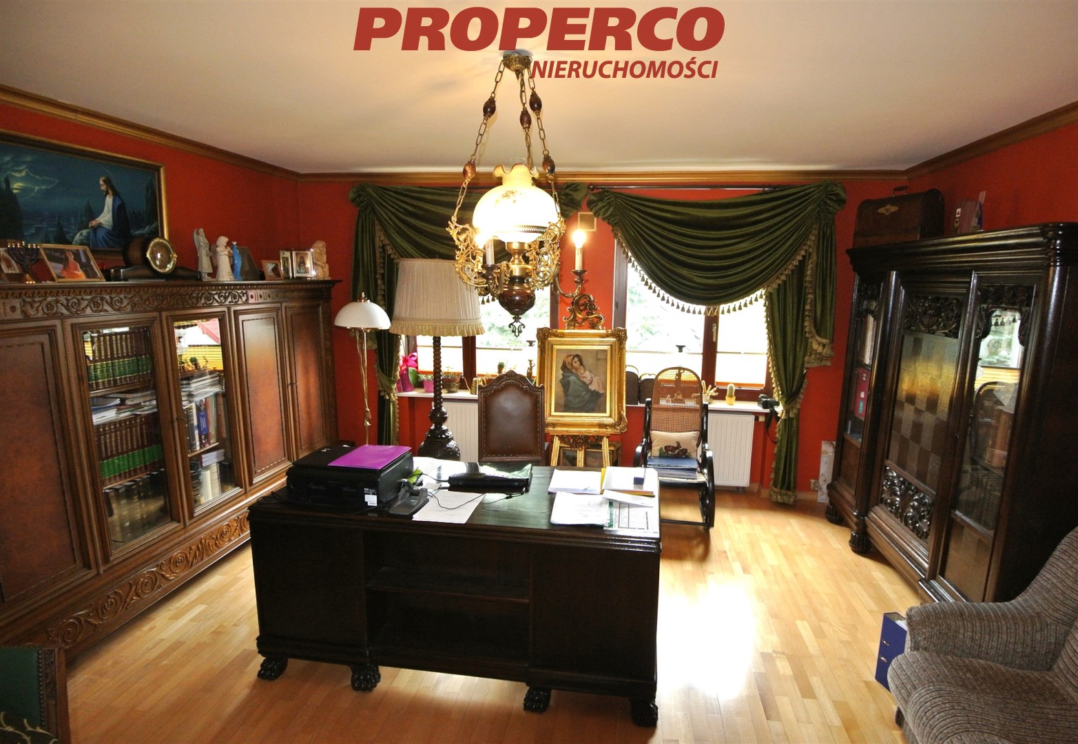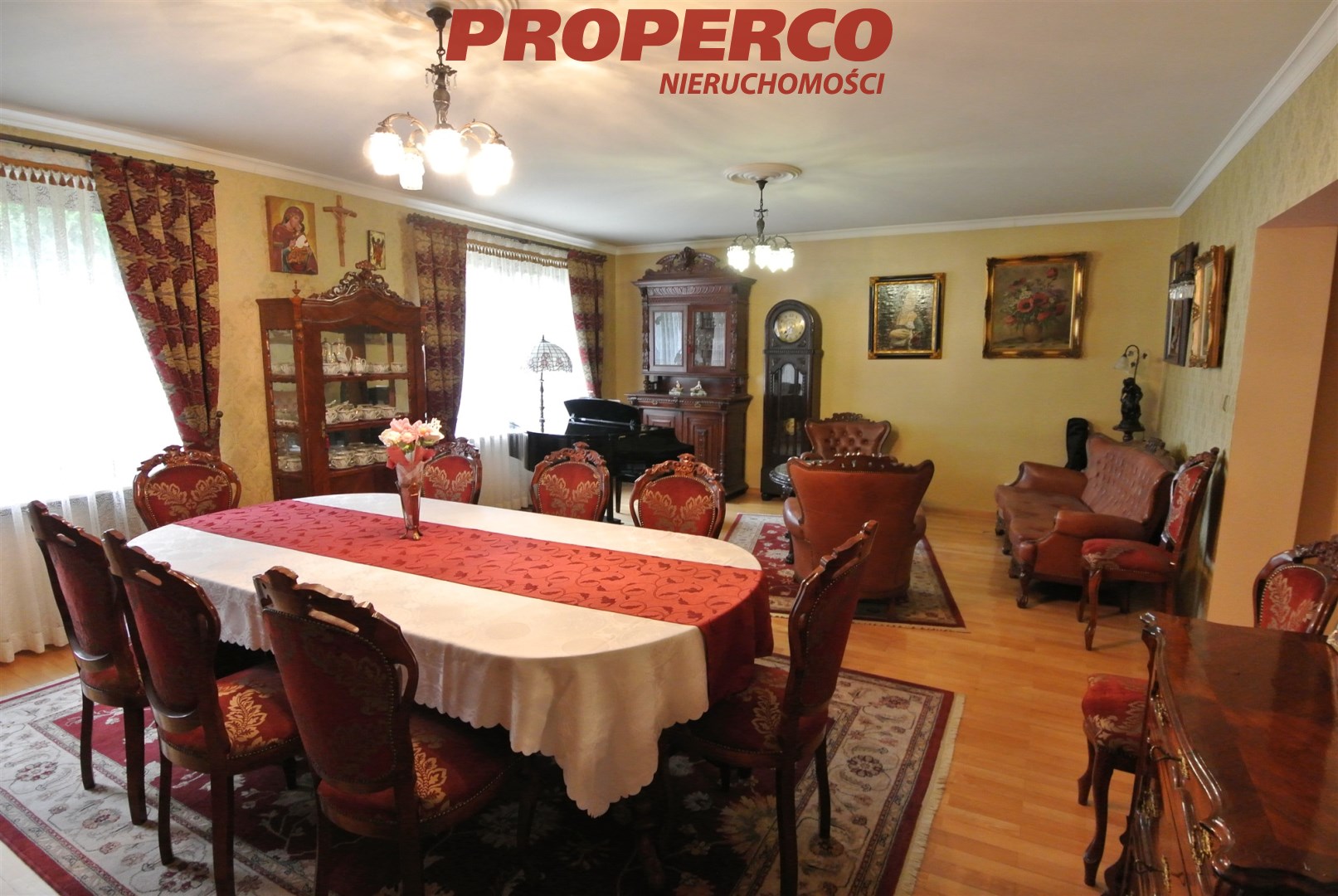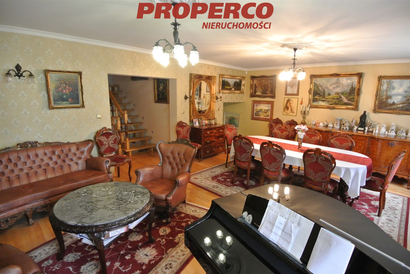 Możliwość zakupu z wyposażeniem widocznym na zdjęciach za dodatkową opłatą (wnętrze domu wykończone w klasycznym stylu, w pokojach znajdują się antyki oraz wysokiej jakości meble wykonane na zamówienie. Na ścianach płótna i obrazy oprawione w ramy, w salonie fortepian).