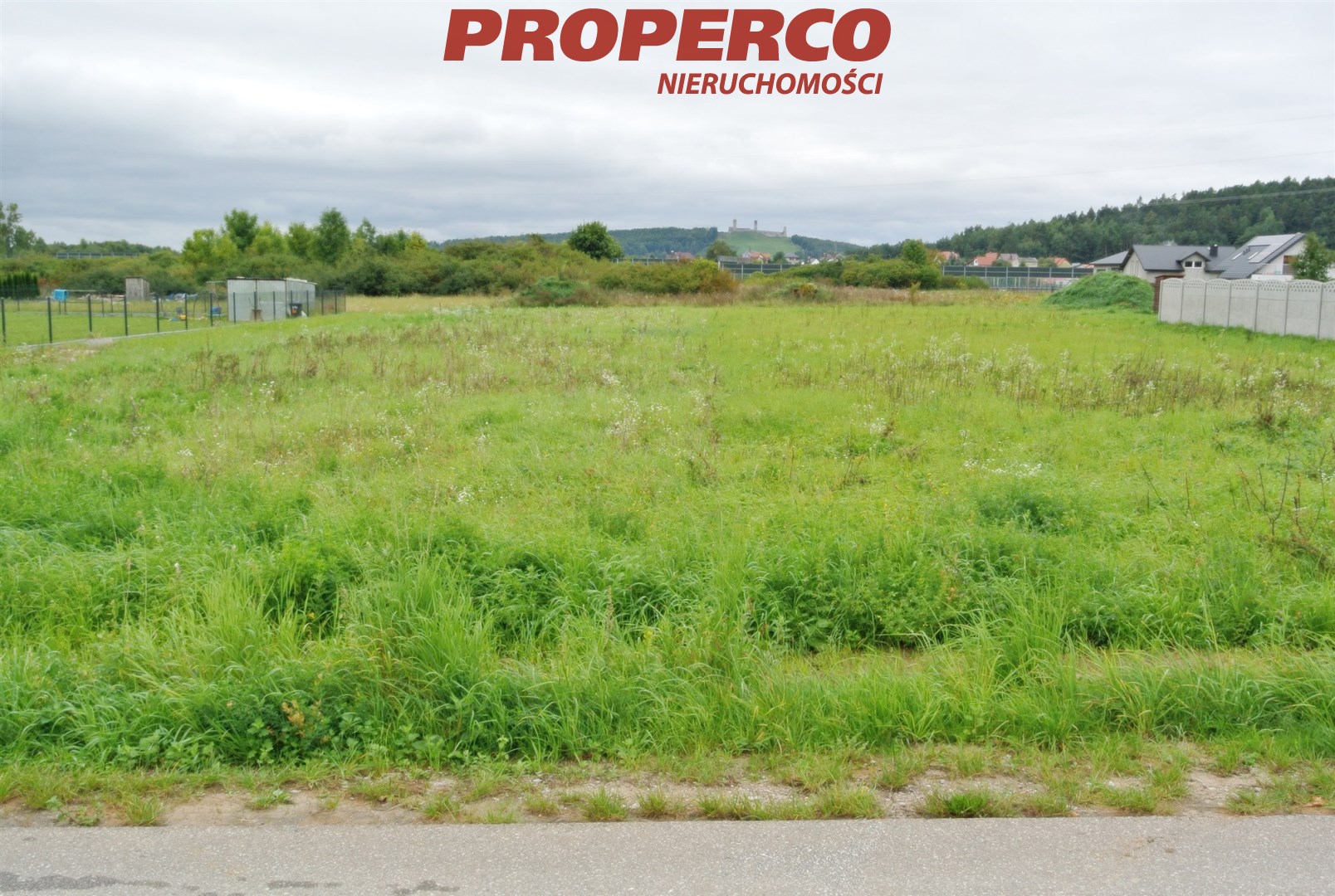 For sale: a plot of land with an area of 1038 m², located in Chęciny. The plot is in the second line from the asphalt road – Sitkówka Street. It is flat, undeveloped, rectangular in shape, and situated among single-family houses.