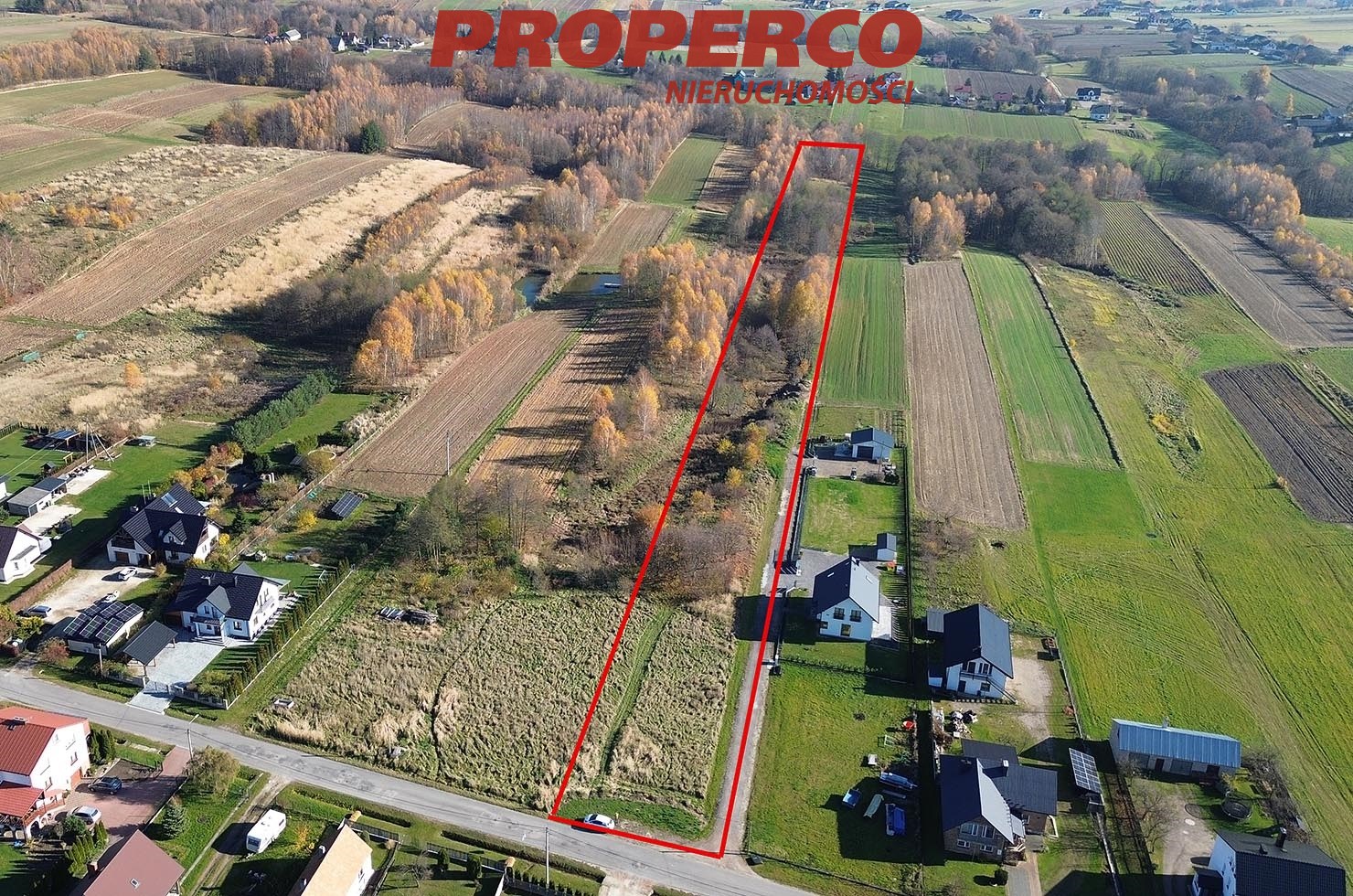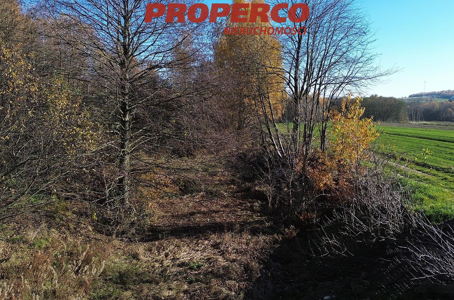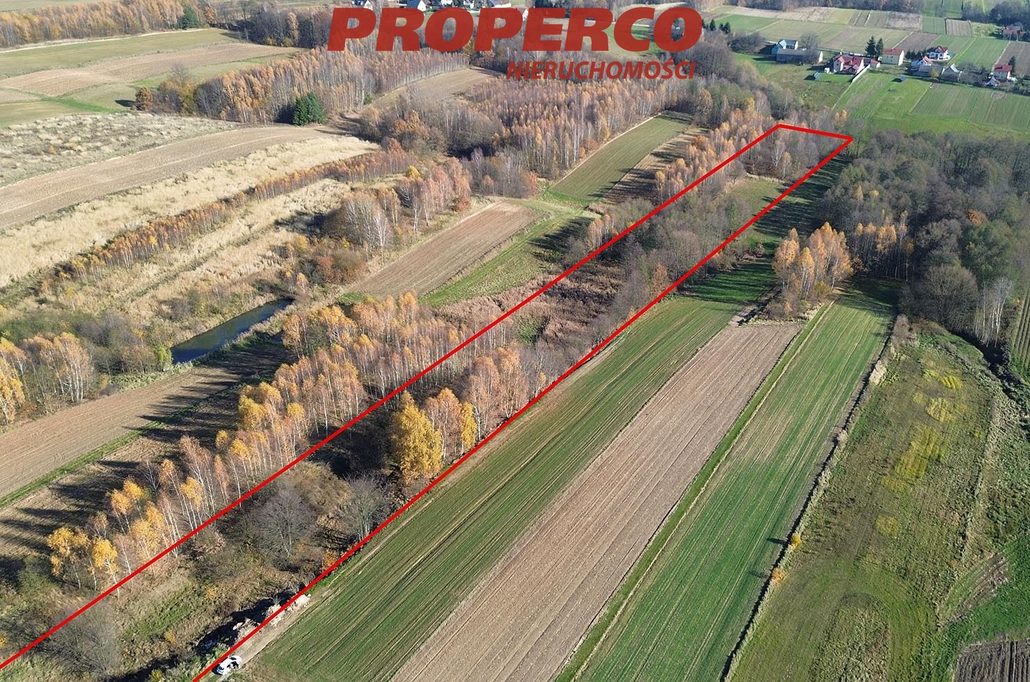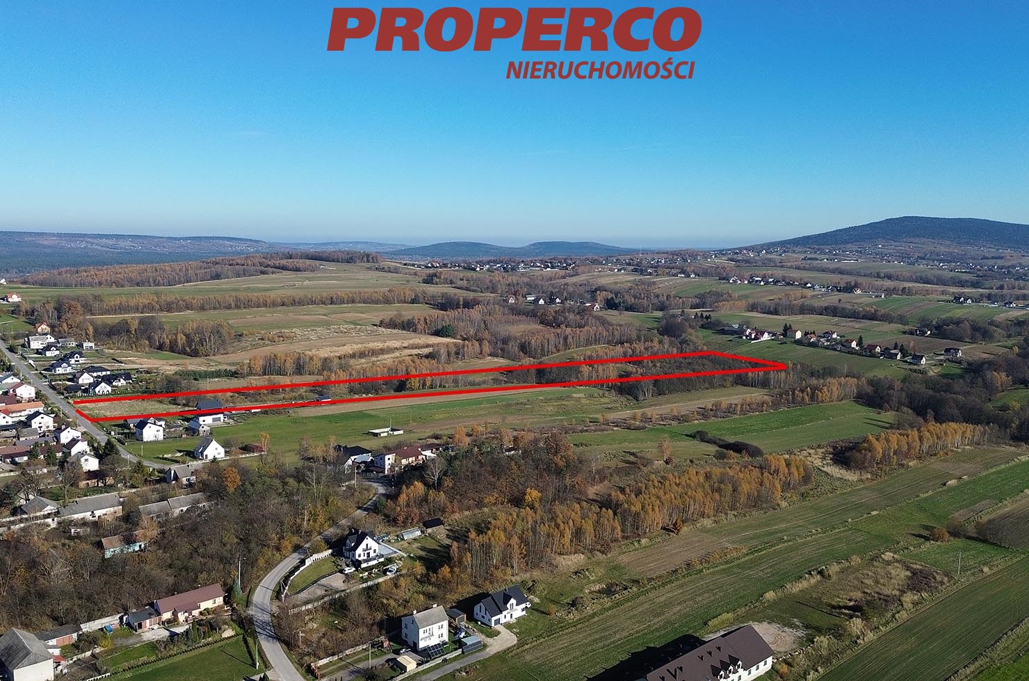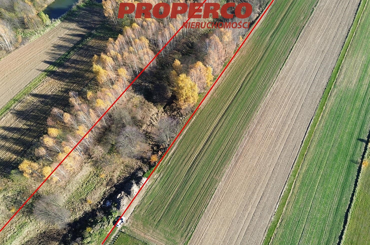 The plot has access from an asphalt road at the front, and a second entrance from the side of the property via a private gravel road. Single-family housing in the vicinity. Convenient access – 20 minutes from the centre of Kielce. The plot is unfenced, undeveloped, undulating, overgrown with tall grass, bushes and trees.