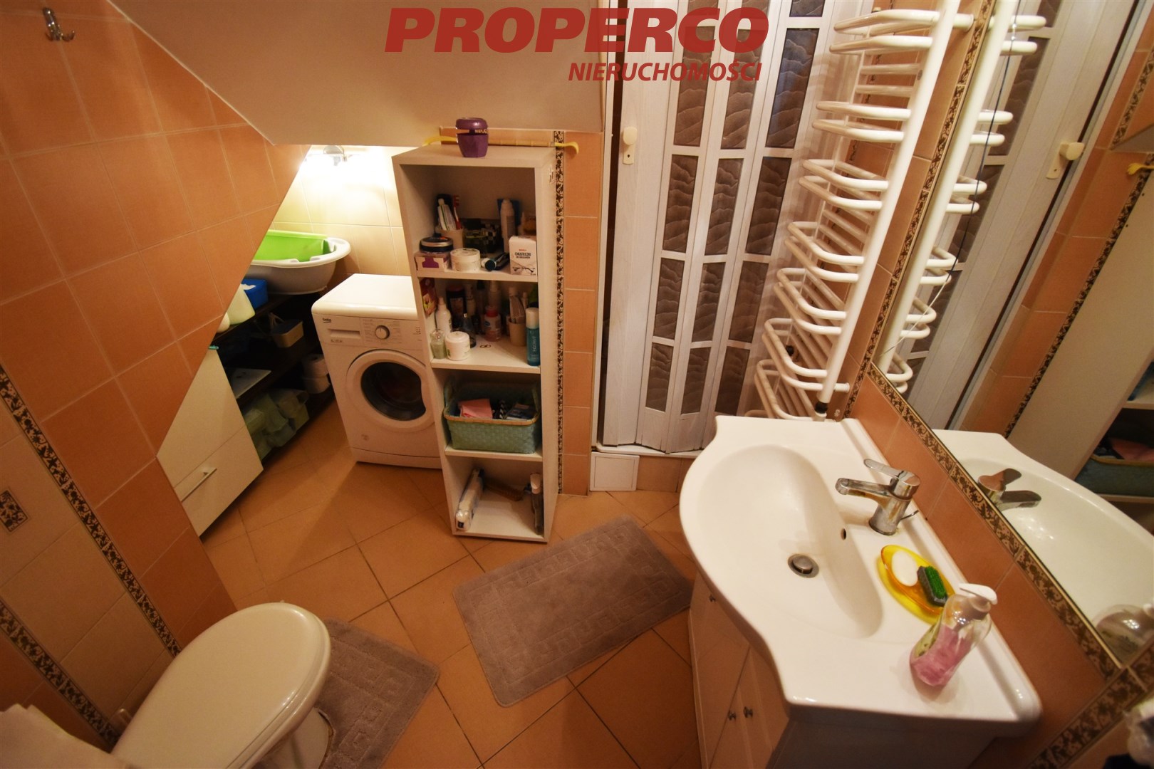 na piętrze: 3 pokoje, łazienka, WC, korytarz. Z jednego pokoju prowadzi wyjście na balkon i taras nad garażem (łączna pow. ok. 85 m2),