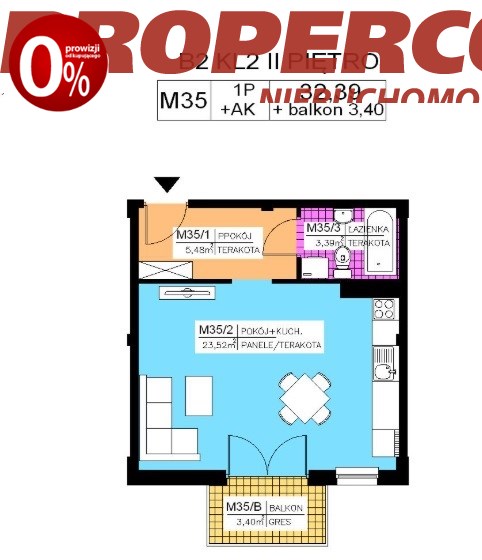 a) salon z aneksem kuchennym (pow. 23,52 m2),