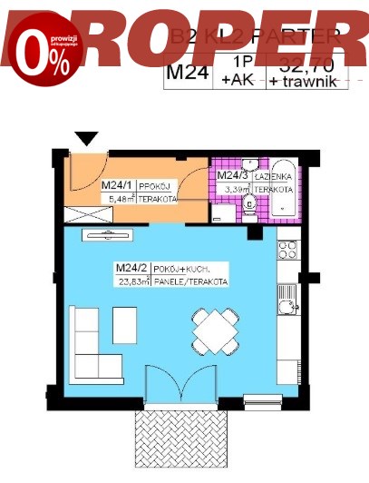 a) salon z aneksem kuchennym (pow. 23,83 m2),