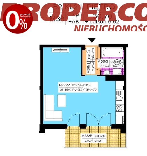 Do mieszkania przynależy balkon o pow. 5,62 m2.