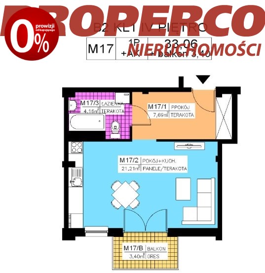 a) salon z aneksem kuchennym (pow. 21,21 m2),