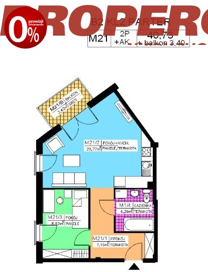 a) salon z aneksem kuchennym (pow. 20,77 m2),