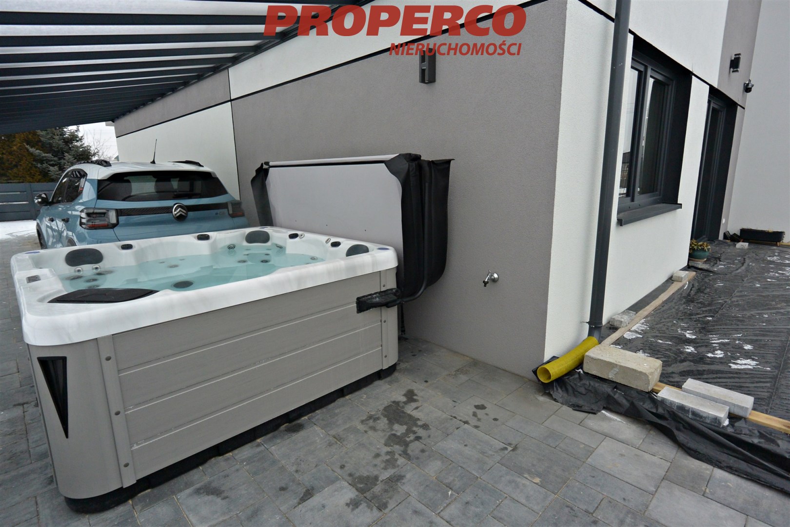 The front of the property is paved with concrete blocks. In addition to the single-car garage integrated into the building, there is an aluminium pergola with a polycarbonate roof outside, providing space for two cars.