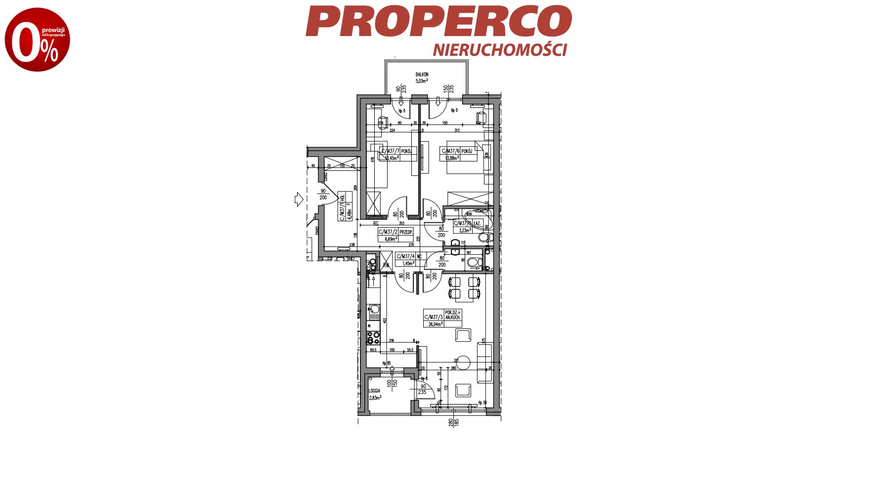 Do lokalu przynależy loggia o pow. 2,83 m2 oraz balkon o pow. 5,03 m2.