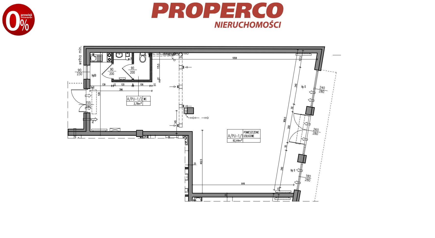 - pomieszczenie główne (92,44 m2),
