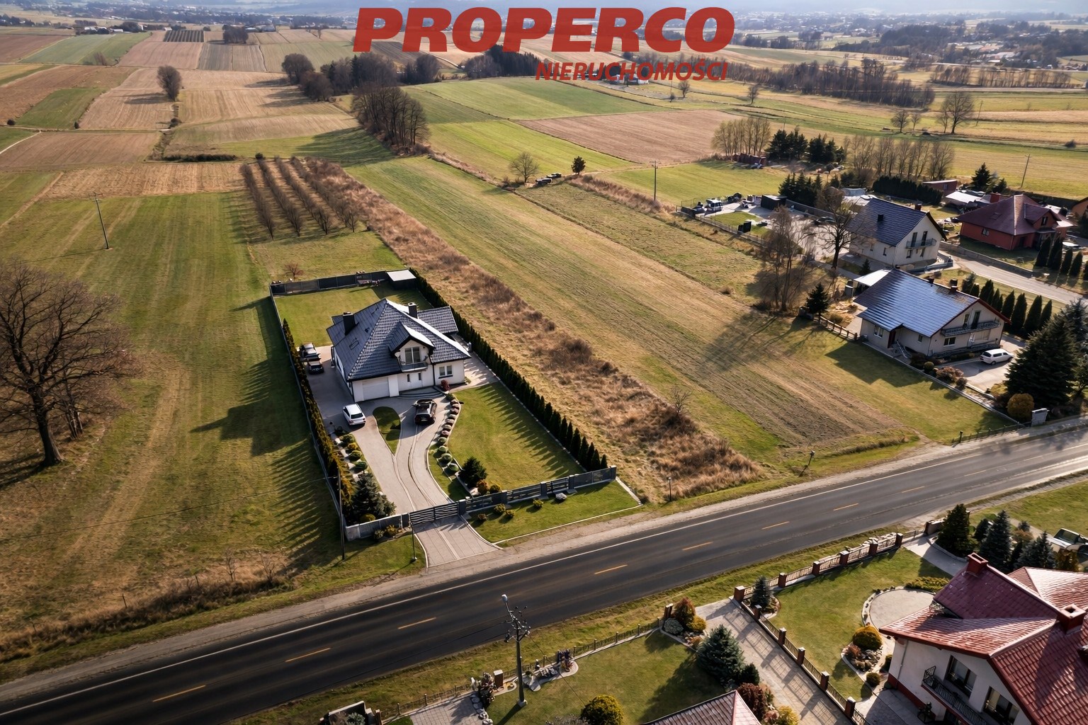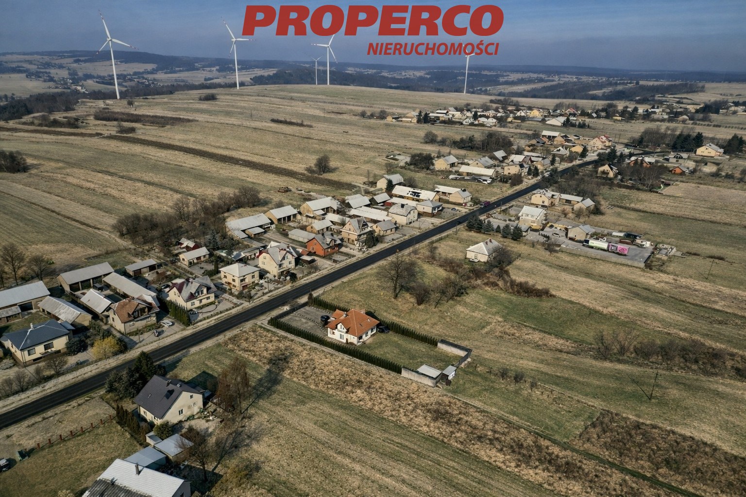 The surrounding area consists of single-family residential buildings, farmstead development, and agricultural farms.