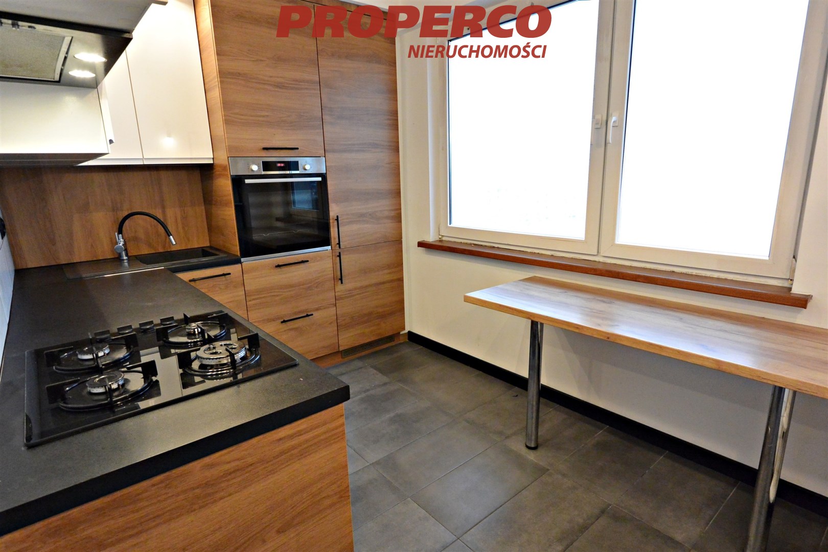 The apartment has been renovated. PVC window frames, kitchen equipped with several-year-old Bosch appliances (refrigerator, dishwasher, gas hob, oven), laminate flooring in the rooms.